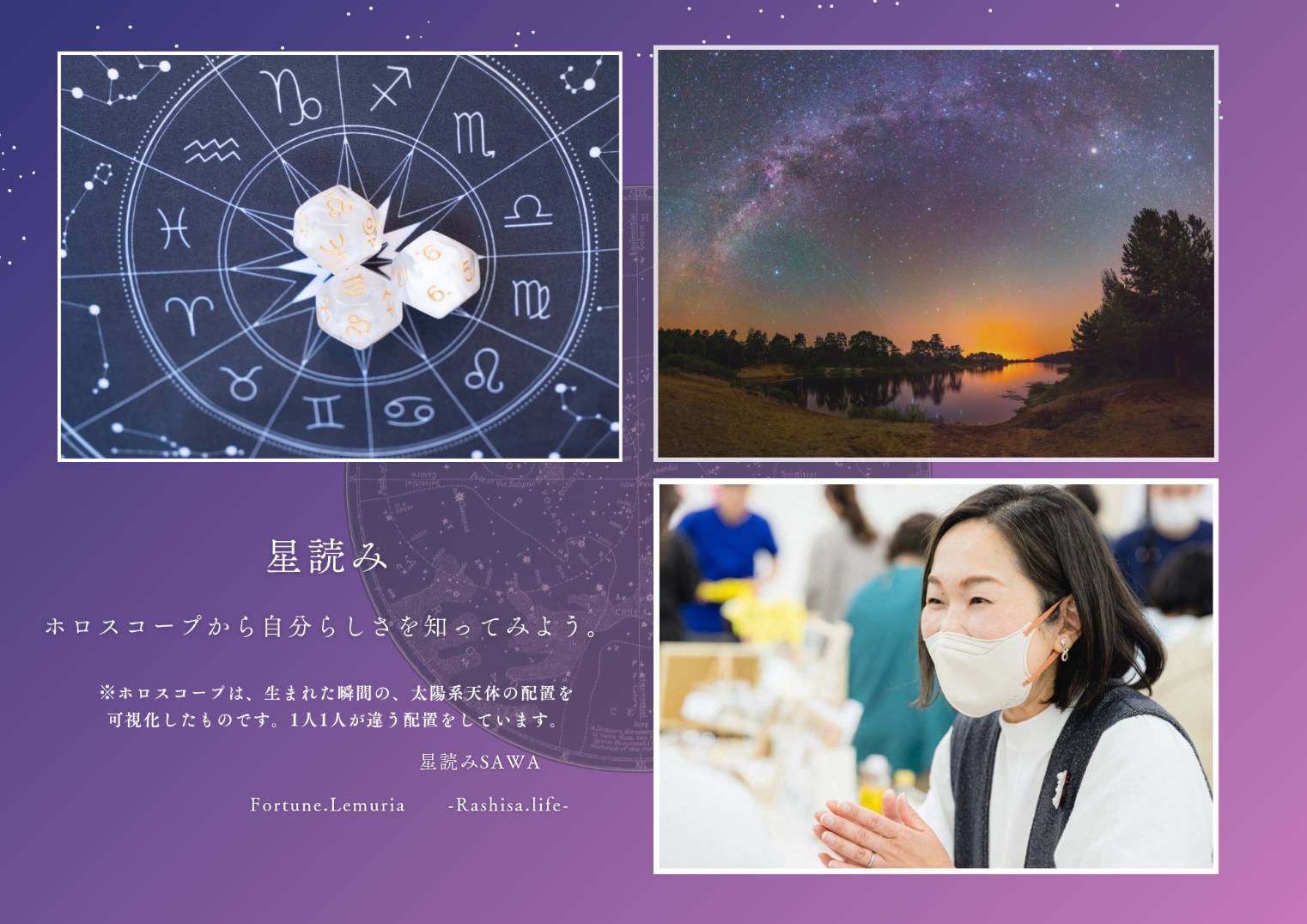 | 星読む居場所 星読み占い ☆ホロスコープから自分らしさを知ってみよう☆ 生まれた瞬間の天体の配置=ホロスコープから、私たちは1人1人違うホロスコープを持っています。 得意なこと、苦手なこと、色々な“自分らしさ”がぎゅっと詰まっています♡ 星読み鑑定 20分/1,000円 中高生:15分/500円 (ご予約不要、当日受付順) ※生年月日(西暦)、出生場所(市町村または都道府)、出生時間(不明の場合はご相談ください) ![]() |