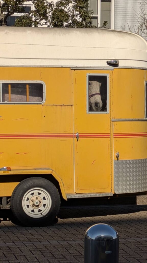 11時からのスタートに合わせて、なんとも可愛いウエスタン調の馬運車(馬を輸送する専用車)が10時過ぎにweほーるに到着。小さな窓からお馬さんが覗いているではありませんか♡もう感動しかありません!